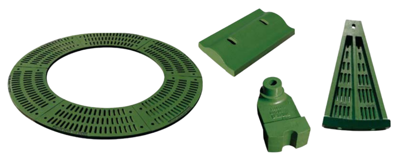 Typical applications: lining plates, dividers and grates for ball/rod mills, grinding rings and cylinders for roller mills, among others. -